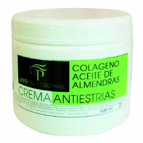 Crema anti estrías con colágeno al 5 %, que es un rellenador, con rosa mosqueta al 3% como regenerador celular, y aceite de almendras al 8% como hidratante, nutritivo y regenerador.